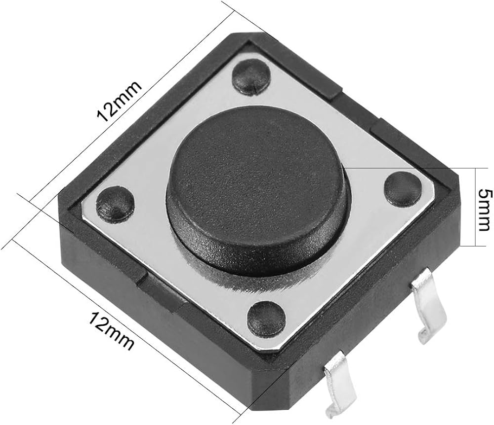 Pulsador de 4 pines, tamaño 12×12×5 mm, ideal para montaje en PCBs. Perfecto para prototipos, controles de usuario y aplicaciones electrónicas compactas. Alta durabilidad y fácil integración.